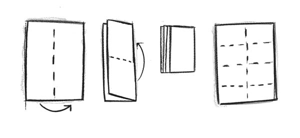 Step One: Grab a rectangular piece of paper; think printer or construction paper, but anything will work. Turn it horizontally and fold it in half, then fold it in half both ways, creasing the edges as you go to create four panels. The goal is to fold the paper so that when unfolded, there are eight panels in total.