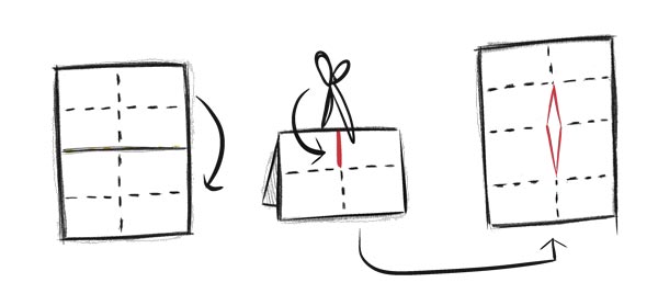 Step Two: If you unfolded the paper, refold it in half, then in half again, so you see four panels. Then cut through only halfway from the folded edge – so when the paper unfolds, there’s a cut in the exact middle of the page, right between the middle four panels.